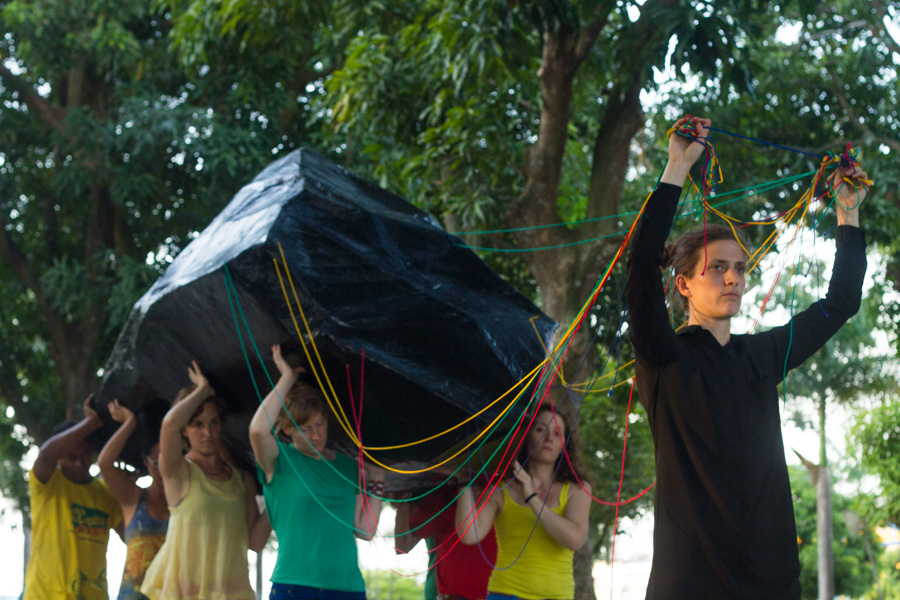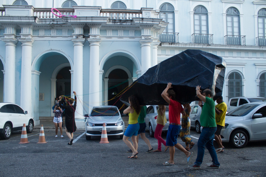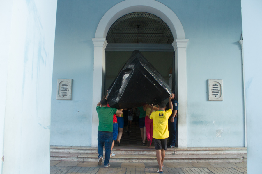 Optimus III - The Paper Stone is a performance in which a sculpture is transported to the Museum of Fine Art, obeying the itinerary of the Procession of the Virgin of Nazareth taking place in the streets of Belem annually.